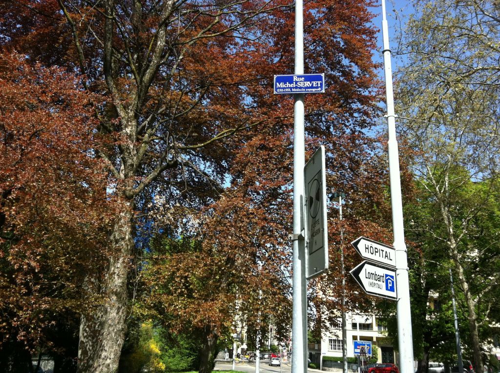 We walked together across Bourg-de-Four Square, him in chains and me in air, up rue de Saint-Antoine out towards Champel. My home, and the place he was tied with his book and burned. This burning of Servetus by the canton of Geneva symbolized the sacrifice of the freedom of conscience and due process of laws.