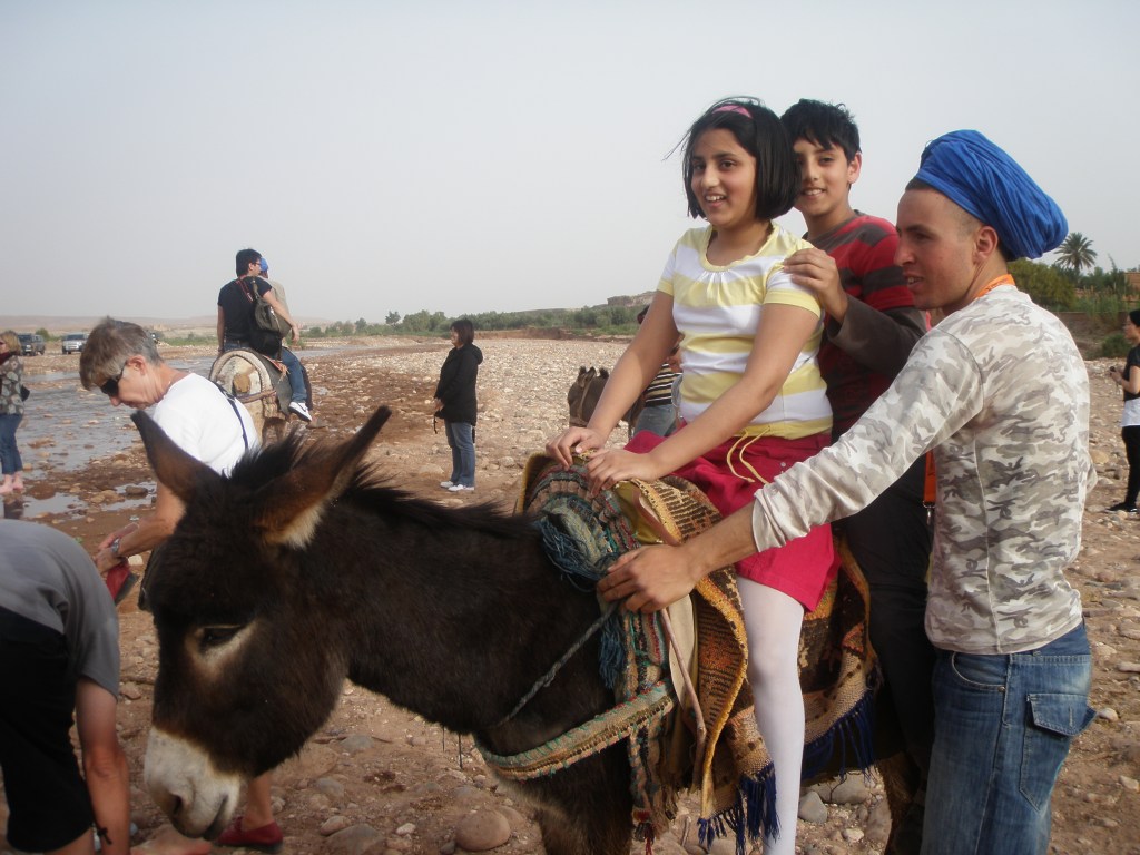 It originally was a resting stop for caravans carrying salt across the Sahara and returning with gold and slaves. Recognizing the magic of this setting numerous movies have been staged here like my favorite Indiana Jones (and the Jewel of the Nile). So, like Indiana, I jumped upon the back of a noble looking donkey with an overtly amused teenage berber boy leading the donkey and a girl with a ponytail (me of course) across this raging stream (puddle). However, I noticed that when I dismounted that the boy released an audible long deep sigh. Then again upon my return trip across the puddle, upon dismounting he did the same! I looked him squarely in the eye and he averted his gaze turning crimson. I then sensed that I was witnessing something special, this boy was completely in sync with his donkey, one with the beast. So, when I dismounted, perhaps he sensed a burden off his shoulders or perhaps he sensed my body pressed against his donkey upon dismounting, obliquely experiencing the sensation. Well, I thought to myself that unless I was leaping dragon, there was no other way of getting off the donkeys back. So I returned a little more connected having shared a piece of the story between a Berber boy, his donkey and the demanding desert. See Below The Berber Boy his Donkey and The Raging Stream (puddle) ferrying the kids to get to Ait Benhaddou: