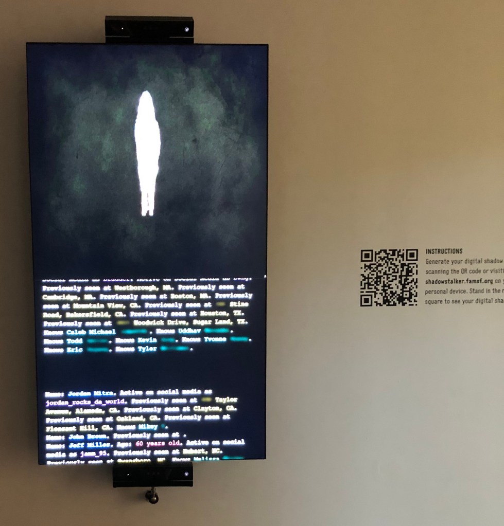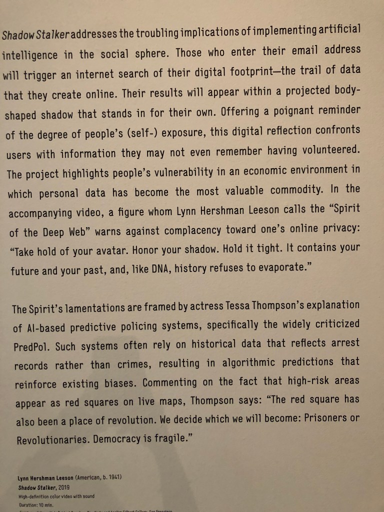 See below an installation by Lynn Hershmann Leeson at The De Young Museum in San Francisco titled Shadow Stalker addresses the troubling issues with implementing AI in the social sphere. Warning against complacency towards our online privacy highlighting how we inadvertently entrap ourselves within our digital footprints by relinquishing pieces of data, emails, addresses, geolocations, social media commentary, thereby exposing ourselves to various AI predictive policing tools which is subsequently used to identify, target, and manipulate us without our assent or knowledge stripping away any expectation of privacy. This installation demonstrated how simple piece of information volunteered can recreate a complete shadow image comprising of all your personal information: