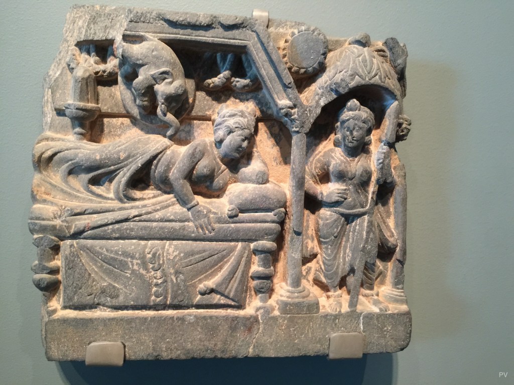 I wish to ask him for just one Night in the Museum, so that I might bring to life the relics of my culture, the sagas that have inspired me. So that I may unfreeze the friezes and breathe life into the Dream of queen Maya as she reclines on her bed waited upon by her attendants with the vision of the white elephant suspended overhead. I wish to bring her dream/ my dream to life in all its vivid colors released from its petrified form on a wall at the end of the Asian section of the Metropolitan Museum. See below The Dream of Queen Maya from the SFMOMA:
