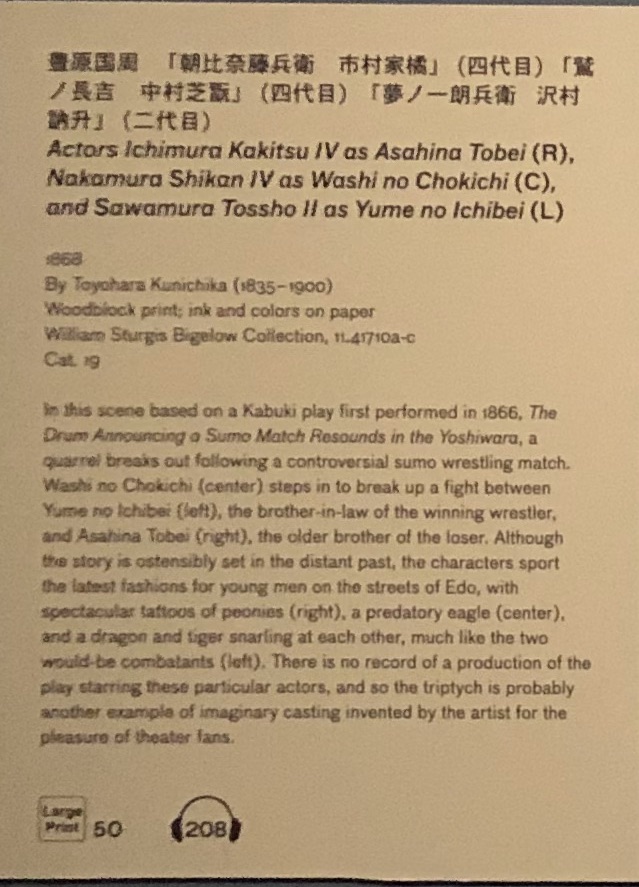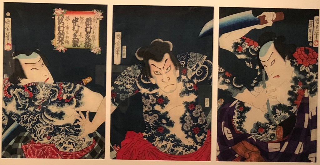See below a fab woodblock print of Kabuki Actors on stage, quarreling and enraged, from the San Francisco Asian Art Museum exhibit on Tattoo’s. An image worth a thousand words as my virtual Kabuki theatre unfolded in all its hues in San Francisco with American actors.