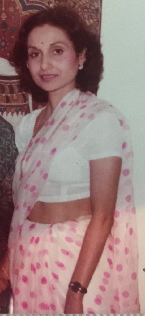 See below a beautiful leaf from my family’s volume, my aunt Kadambari in a pink polka dotted saree (yes it’s the irresistible polka dots again!). Banabhatta must surely have drawn inspiration for his love story Kadambari from a similar image of the damsels of Palghat, India (Roots):