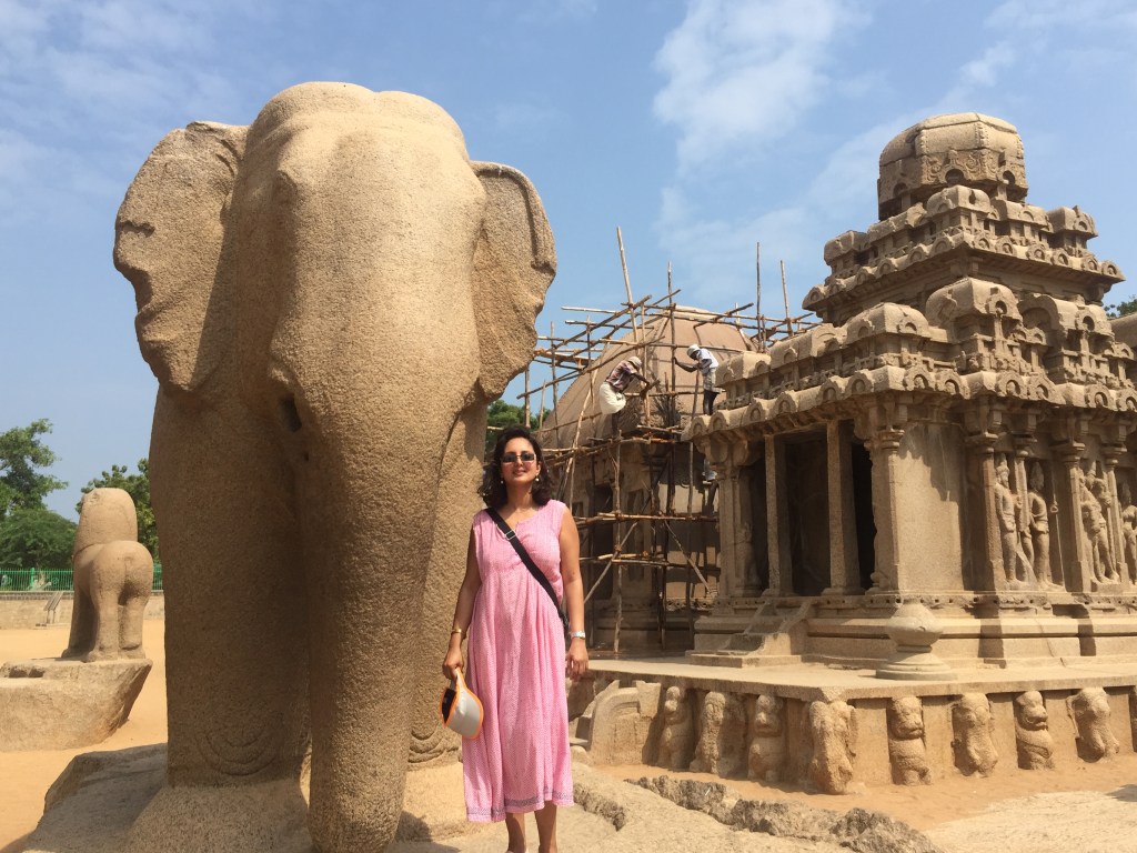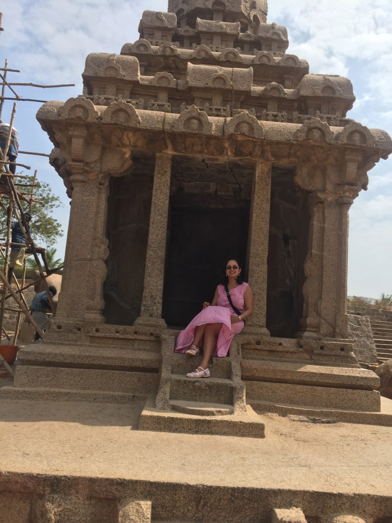 See Purnima in Mahabalipuram, India riding one of the five rock cut chariots, Pancha Rathas, attributed to the chariots of the five Pandavas from the Mahabharata) of this incredible complex in the south of India hewn out of boulders by the great Pallava king Narasimhavarman II, in 690 AD.https://en.wikipedia.org/wiki/Pancha_Rathas