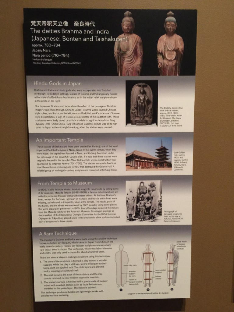 If you remember, during our chat, as you were drawing the thread connecting the cultures of Asia through the Ramayana, I mentioned another network of connections through East Asia and then onto Europe. Once again reiterating, that culture cannot be contained and is not the proprietary right of one person or group, in fact all these great cultural expressions have found their way onto these shores (US shores) on the backs of their people. I had also mentioned to you that I was most fascinated by the Japanese 7th century Nara hollow lacquer standing figures of Brahma and the Vedic deity Indra at the Asian Art Museum (https://mail.google.com/mail/u/2/#inbox/14cffa11bd11746c). See below Nara Lacquer standing figures of Brahma and Indra at the Asian Art Museum San Francisco: