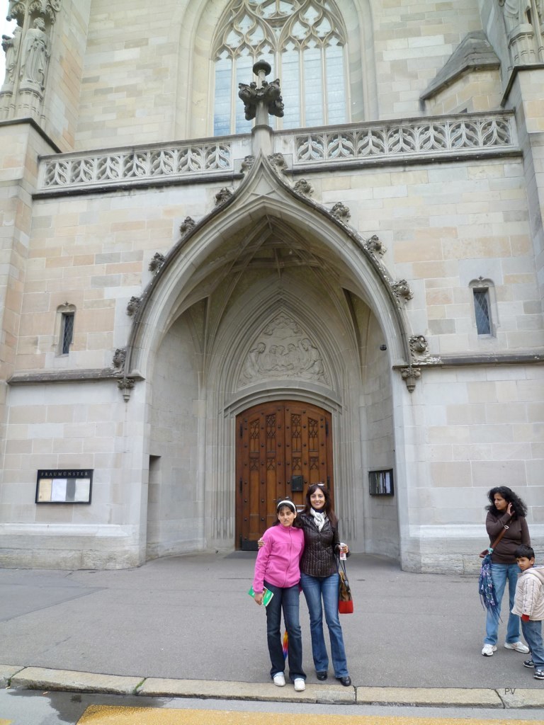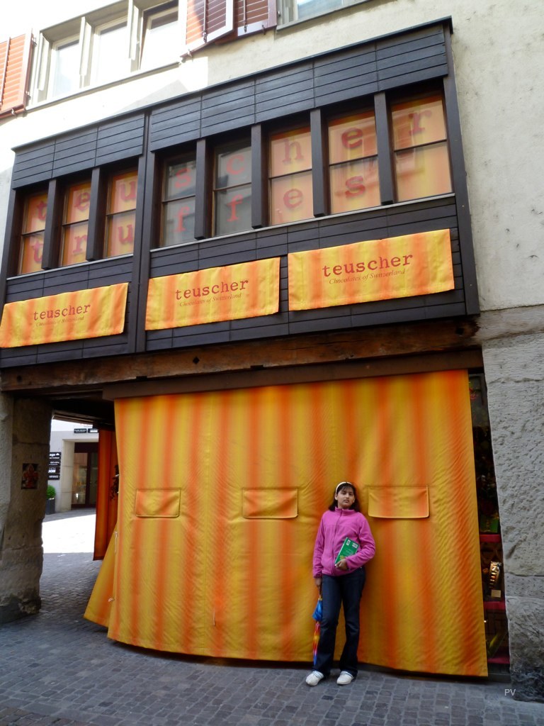 After being drenched by the spray (of the Rhine Falls) and drenched by the rain, we landed in Zurich to spend the night. Zurich is an absolutely charming city with much to discover. The cobbled streets of the old town, the Fraumunster Cathedral with the Chagall stained glass windows, the Candy Store (Chocolate Factory), the magnificent vistas of the twin towers of the Grossmunster cathedral etching the skyline. My absolute favorite, the giant clock face on St. Peter’s Church, supposedly one of the largest in Europe. So we wandered up and down the cobbled streets searching for this giant clock which was visible from every point in the city looming large except when you were very close to it, and we spent half a day playing Peep-a-Boo with the clock face till we finally caught him