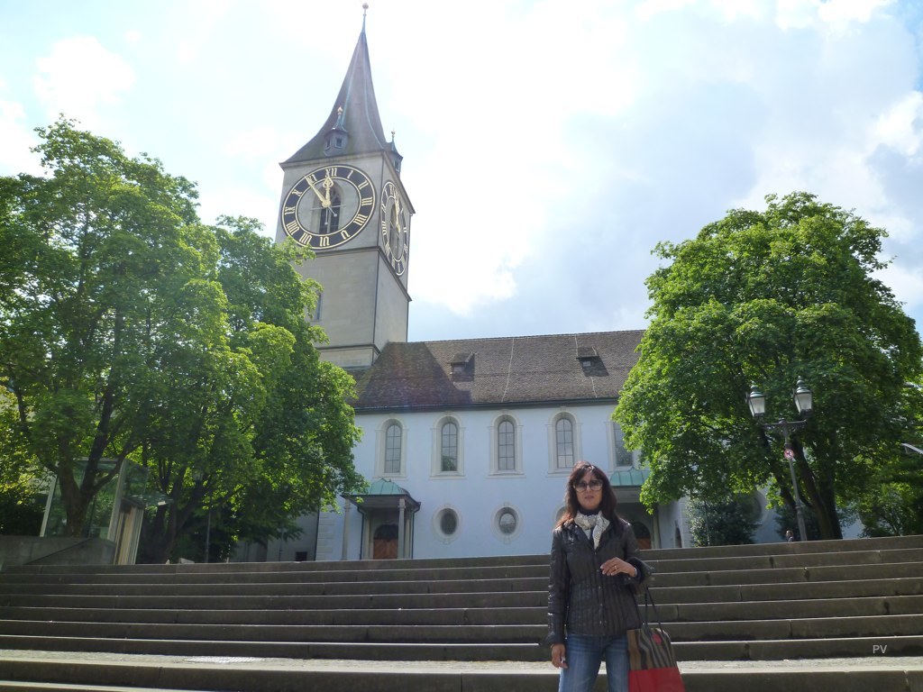 After being drenched by the spray (of the Rhine Falls) and drenched by the rain, we landed in Zurich to spend the night. Zurich is an absolutely charming city with much to discover. The cobbled streets of the old town, the Fraumunster Cathedral with the Chagall stained glass windows, the Candy Store (Chocolate Factory), the magnificent vistas of the twin towers of the Grossmunster cathedral etching the skyline. My absolute favorite, the giant clock face on St. Peter’s Church, supposedly one of the largest in Europe. As we wandered up and down the cobbled streets searing for this giant clock which was visible from every point in the city looming large except when you were very close to it. So, we spent half a day playing Peep-a-Boo with the clock face till we finally caught him (Do check out the photos below)!